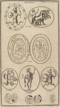 Абраксас [1] (Αβράξας, или Абрасакс — Άβρασάξ ) — нумерологический и графический собирательный образ солнечного божества, изображавшегося на талисманах I — III вв. н.э. в виде человека с головой петуха (олицетворяющей предвидение и бдительность, а также возрождение солнца на рассвете) или льва (царя зверей и солярного символа). В одной руке Абраксас держит круглый или овальный щит (еще один символ солнца), в другой — плеть (символ власти, а также свирепого жара полуденного солнца), либо хлыст, цеп или дубину. Из его тела вырастают две опоры — Нус (Ум) и Логос (Слово), символически представленные в образе змей.