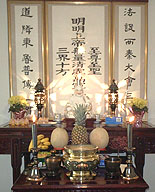 Даосский алтарь во время церемонии поклонения предкам (деталь иллюстрации к роману "Цветы сливы в золотой вазе", ок. 1700 г.). В дальней части алтаря — изображения «Трех чистых» (сань цин — верховных божеств даосского пантеона); справа — кадильница и ритуальный меч; в чашах — жертвенная пища.