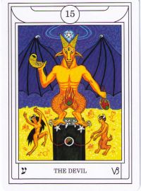 ... на этой карте, 15‑й карте Таро, изображен сатироподобный демон с головой козла, волосатыми ногами, большими когтями и массивными крыльями, как у летучей мыши. Он стоит на кубическом алтаре. Левой рукой он указывает вниз и держит зажженный факел; правая рука поднята, и в ней Дьявол держит рог, наполненный водой. Левая рука опущена в знак того, что огонь этого факела — жгучее адское пламя, а вовсе не животворный небесный огонь. Точно так же в Козероге, холодном знаке Земли, связанном с этой картой, Солнце светит слабее всего. Качества холода и влажности здесь побеждают жар и сухость. Кубический алтарь символизирует Вселенную. К кольцу на алтаре, олицетворяющему центр Земли, привязаны веревкой стоящие справа и слева от алтаря два маленьких демона, один в мужском облике, другой — в женском. Они держат веревку в руках. Все это изображение в целом символизирует грубые производительные силы природы на материальном плане. Его ассоциируют с греческим Паном и с египетским Козлом Мендеса, символом Хем. В некоторых своих проявлениях этот аркан символизирует свирепые природные стихии, которые, с точки зрения человека неверующего, беспросветно темны и не отражают в себе Лик Господа. Кроме того, данная карта служит символом сексуальной энергии и продолжения рода. Таким образом, она оказывается полноценным противовесом карте «Смерть», расположенной по другую сторону Древа Жизни[4].