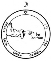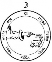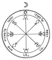 Примечание Мазерса. Божественные Имена IHVH и Элохим (Elohim), тайный знак Луны и Имена Ангелов Иахадиэля (Iachadiel) и Азареля (Azarel). Стих взят из Псалма LXVII, 1 "Да восстанет Бог, и расточатся враги Его, и да бегут от лица Его ненавидящие Его".