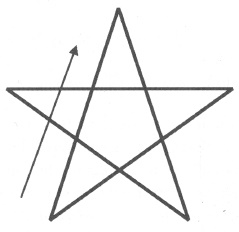 - 2. Продолжая стоять лицом на восток (как при исполнении ритуала Каббалистического креста), начертите перед собой указательным пальцем правой руки изгоняющую пентаграмму Земли. Это прямая пентаграмма (обращенная одной вершиной вверх), которую следует чертить неотрывно в следующей последовательности: нижний левый угол (Земля) — верхний угол (Дух) — нижний правый угол (Огонь) — средний левый угол (Воздух) — средний правый угол (Вода) — нижний левый угол (Земля). Начертав пентаграмму, сделайте Знак Входящего, и «зарядите» («оживите») ее вибрацией Божественного Имени IHVH (Йод-Хе-Вав-Хе) [5].