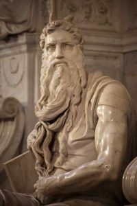 Когда сходил Моисей с горы Синая, и две скрижали откровения были в руке у Моисея при сошествии его с горы, то Моисей не знал, что лицо его стало рогато оттого, что Бог говорил с ним (Исх. 34: 29).