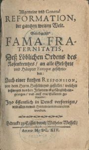 О происхождении розенкрейцеров известно следующее: в 1614 году печатник Вильгельм Вессел из немецкого Касселя выпустил в свет брошюру под заголовком «Всеобъемлющая и Всеобщая Реформация всего этого пространного Мира в целом. Вкупе с Fama Fraternitatis [Откровением Братства] Высокочтимого Ордена Креста Розы, составленным для уведомления всех Ученых мужей и Государей Европы: Также с присовокуплением краткого Ответа Господина Хазелмайера, за который ответ он был схвачен Иезуитами и закован в железа на Галере: Теперь обнародовано в Печати и обращено ко всем искренним Сердцам. Напечатано в Касселе Вильгельмом Весселем, Год 1614». Первая часть брошюры «Всеобъемлющая и Всеобщая Реформация» представляла собой немецкий перевод (причем, сделанный без разрешения автора) одного диалога из «Известий с Парнаса» (De'ragguagli di Parnasso, 1612 г.) итальянского писателя Траяно Боччалини, резкой сатиры, где бог Аполлон, созвав для наведения порядка в мире совет мудрецов, выслушивает их нелепые предложения и наконец издает законы, регулирующие рыночные цены на овощи, после чего все в радостном настроении расходятся по домам.