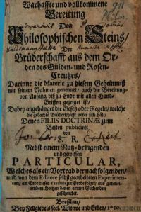 - В переизданиях устава «Gold- und Rosenkreuzer» в 1737 г. (Testamentum der Fratemitat, L.K.Orvius, Occulta Philosophia), в 1747 г. (Fictuld, Goldeness Vliess), в 1763 r. (Tabella pro concordia Fratrum Roseae et Aureae Crucis, Прага), в 1767 г. (Schleiss von Lowenfeld) и в 1777 г. (Schroder, Bischofswerder) тоже отсутствует какая-либо ссылка на исторических розенкрейцеров XVII века. Некоторые французы, как, например, Мартинес де Паскуалли, даже полностью отошли от названия «Розенкрейц» и говорили исключительно о «Reau-Croix», имея в виду, например, высшую степень Ордена Избранных Коэнов. Казалось бы, изначальные Манифесты начали уходить в забвение, несмотря на их переиздание Фридрихом Николаи (Friedrich Nicolai) в Берлине в 1781 г., но и в 1783 г. текст Fama Fraternitatis был вновь опубликован в «Berliner Archiv fur Freimaurer und Rosenkreutser». Многие подписчики посчитали, что в нем прозвучал своевременный призыв к созданию нового тайного общества, и зарегистрировались как его члены. Поэтому предисловие к очередному номеру издатель «Архива» снабдил разъяснениями. К счастью, существовали также последователи розенкрейцеров и им симпатизирующие, отнюдь не забывшие изначальную историю Ордена, такие, как издатель книги Missiv ап die Hocherleuchtete Bruderschaft des Ordens des Goldenen und Rosenkreuzer (Собрание документов возвышенного Братства Ордена Златорозового Креста, 1783 г.), сопровождавшейся неаннотированной библиографией, включавшей около 200 рукописей [8].