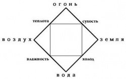 Сто лет спустя другой великий греческий философ Аристотель (384 — 321 до н.э.) утверждал, что природа состоит из четырех элементов: огня, воды, воздуха и земли, каждый из которых характеризуется сочетанием двух качеств — активных и пассивных.