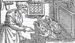 Ведьма с фамильярами, эстамп из памфлета: Anon. The most strange and admirable discovery of three Witches of Warboys. London, 1593.