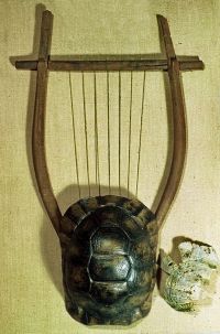 В Древней Греции черепаха является одним из атрибутов бога Гермеса. Легенда гласит, что однажды Гермес задумал украсть у Аполлона коров, которых тот пас на лугу. По пути на дело он повстречал черепаху, панцирь которой очень приглянулся Гермесу в качестве основы для музыкального инструмента — лиры. Он отнёс черепаху домой, выкрал коров у Аполлона, но, будучи разоблачённым, был вынужден вернуть их. Когда же музыкальный инструмент был готов, Аполлон настолько очаровался певучестью и изяществом лиры, что предложил Гермесу обмен на всё тех же коров. Сделка состоялась. В третьем Гомеровом гимне описывается, как Гермес выпотрошил черепаху, прикрепил к ней два стебля тростника и перекладину, натянул на конструкцию семь струн из овечьих кишок и начал божественное музицирование[4]. В древнегреческой мифологии с черепахой связана легенда о нимфе Хелоне (др.-греч. Χελώνη, «черепаха»), обитавшей на горе Хелидория ((др.-греч. «богатая черепахами»), упоминаемой в комментарии Сервия к «Энеиде». На свадьбу Зевса и Геры Гермес пригласил всех богов, людей и животных. Только Хелона отказалась прийти на празднование, за это Гермес сбросил дом Хелоны в море над рекой и превратил её саму в черепаху. В другой версии мифа, изложенной в одной из басен Эзопа, Гермес отсутствует, а своё отсутствие на свадьбе нимфа объясняет тем, что нет места лучше собственного дома, за что Зевс превращает её в черепаху, вечно носящую дом на спине.