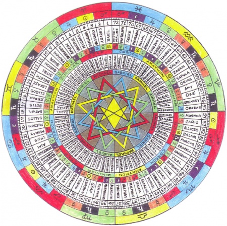 «Четверо Керубим в углах карты символизируют утвержденную Вселенную; дева же окружена эллипсом, составленным из семидесяти двух окружностей, которые обозначают полудеканаты зодиака и Шемхамфораш» [4].